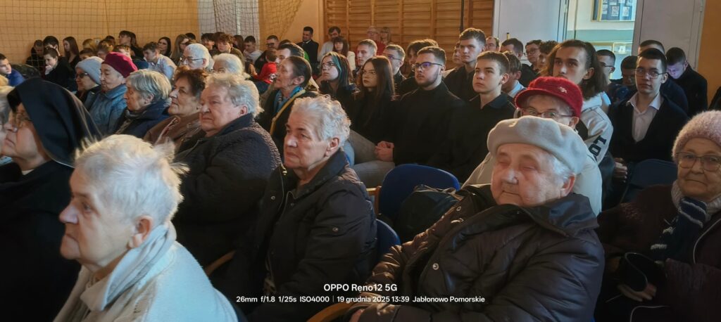 W naszej szkole zapanował wyjątkowy, świąteczny nastrój, który połączył całą społeczność szkolną i zaproszonych gości. W sali sportowej odbył się seans filmu „Ocaleni” – współczesnej wersji biblijnej historii Bożego Narodzenia, zrealizowanej przez uczniów pod kierunkiem pani Justyny Prajs oraz siostry Katarzyny Sochaczewskiej. Film, wzbogacony o cytaty z Biblii, skłaniał do refleksji i poruszał swoją aktualnością. Wyjątkowym elementem projekcji był szkolny chór, który śpiewał do filmu na żywo, tworząc niezwykle poruszającą oprawę artystyczną.